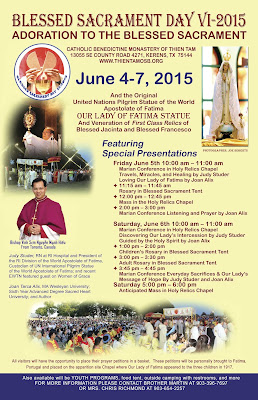 We are extremely blessed to have a Children's Rosary being held at this years Blessed Sacrament Day. This Conference is being held at the Catholic Benedictine Monastery of Thien Tam in Kerens, Texas USA. The four days of speakers and prayers are held almost exclusively in Vietnamese with thousands of attendees from around the United States and abroad. This year for the first time they will be holding a Children's Rosary in front of the Blessed Sacrament at 3PM CT Saturday June 6th. All are invited to unify prayers with the children at this time. We are also extremely blessed to have Joan Alix speaking on behalf of the Children's Rosary. She has also graciously offered to help make our Children's Rosary books and CDs available at an information table at the event. All of our materials will be available free with a humble request for donations for those that are able.