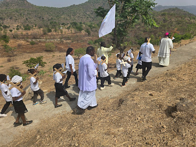 The event started with a meditative walk round the mountain led by the Bishop Most Rev Dr. Philip Davou Dung while the Children's Rosary group, Holy Childhood Association, Young Missionaries Movement, followed in that order of the procession. Also, the different Deaneries were stationed accordingly for the mountain tour. With each participant having a wooden cross, the jubilee flag, and a rosary, the mountain was rounded.